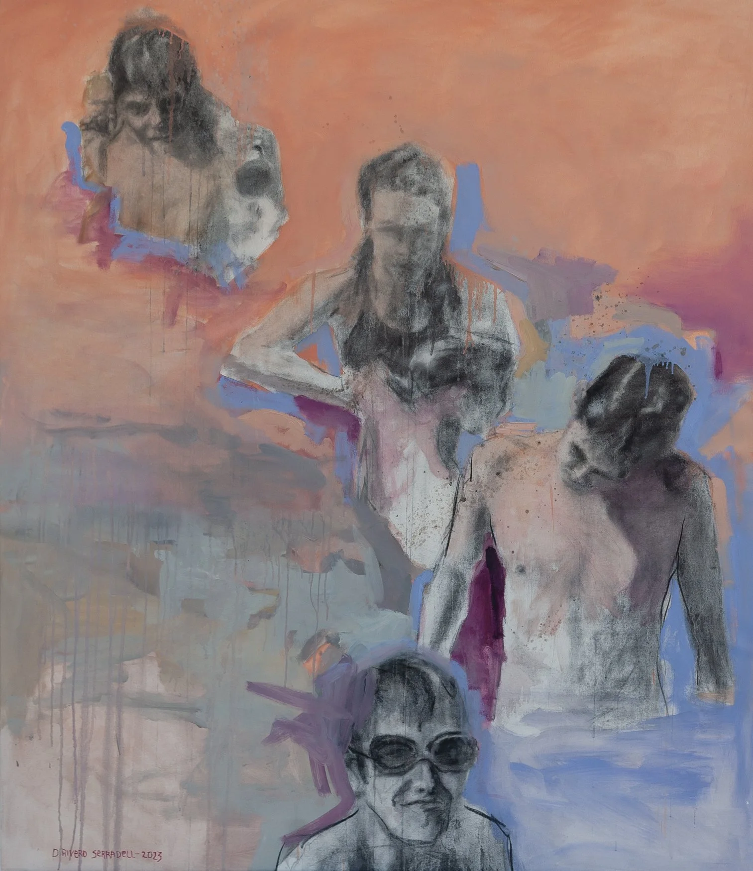 Su obra nace del choque entre lo figurativo y lo abstracto. No busca el equilibrio, sino tensión: cuerpos dibujados en carboncillo que se enfrentan al color, al gesto, a lo inestable